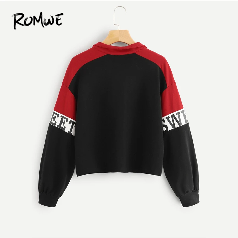 DOWNLOAD IMAGE Romwe Black Colorblock O Ring Zip Front Letter Sweatshirt Women DOWNLOAD...